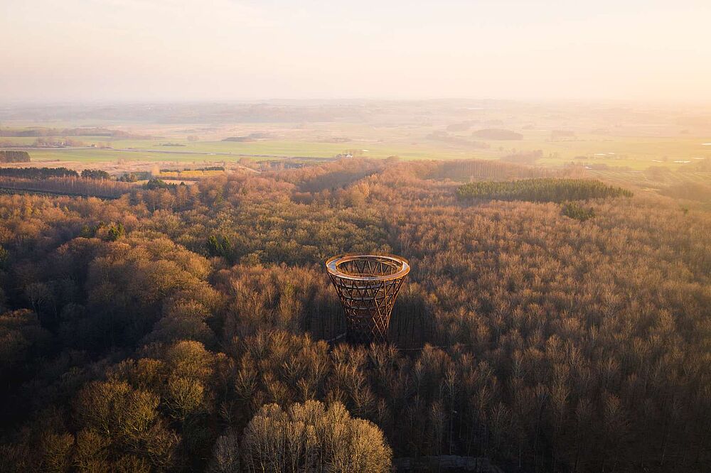 At gå op ad spiralen føles ikke stejlt, men mere som en stille rejse op gennem højderne – næsten meditativt. Man kan stoppe på vejen og kigge ud gennem åbningerne, hvor udsigten gradvist folder sig mere og mere ud. Og hvilken belønning der venter dér. På toppen venter det helt store øjeblik med en 360 graders panoramaudsigt over Sydsjælland, og på dage med klart vejr kan skimte både Øresund og Storebæltsbroen.